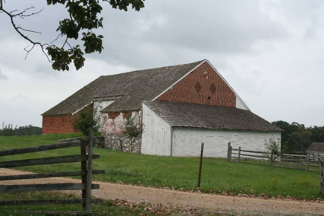 there is a red barn, and to the right of that the Pennsylvania Memorial.