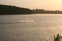 water craft skimming across the lake.