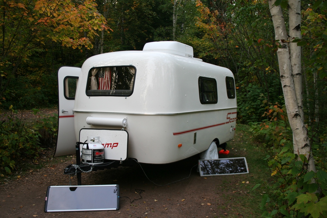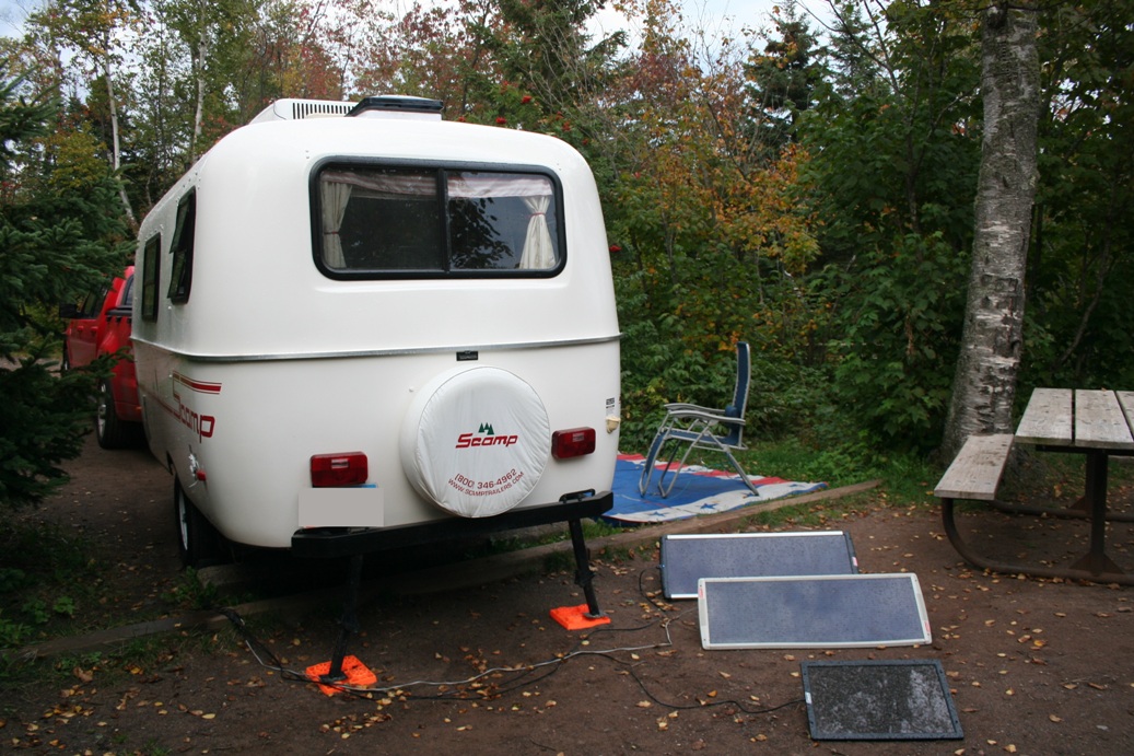 While our Scamp was fairly complete when we purchased it, we have made some modifications over the years to improve the function and utilization of the camper. While I have these shown and described on the various Scampering About pages, I thought it would be a good idea to have a single page that shows all of the modifications we have made over the years as a single point of reference. Below you will see how we incorporated solar panels, added 12-volt accessory receptacles, switched to LED lighting, and more. Solar Panels for Boondocking