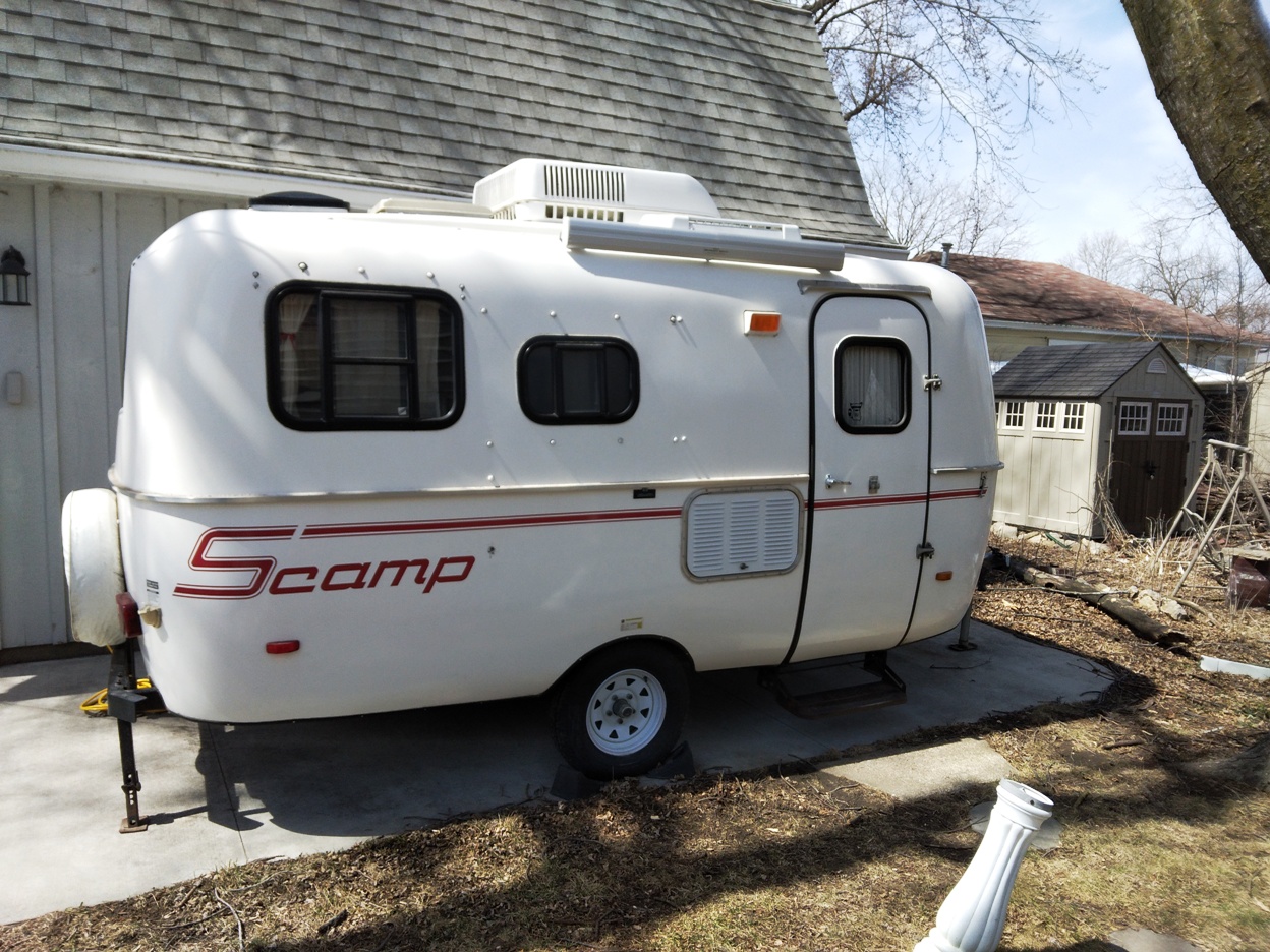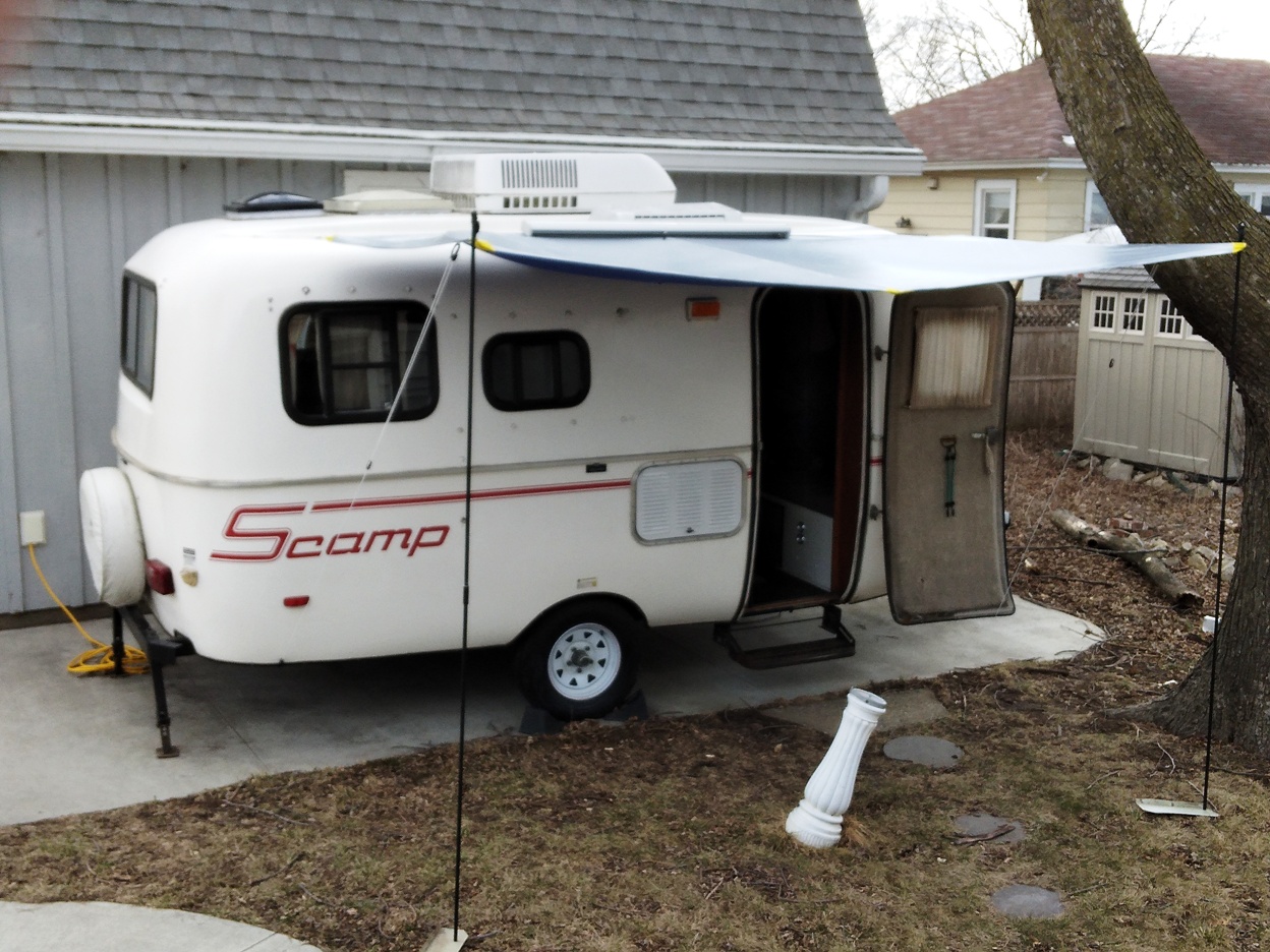 I have been thinking about it for a few years, but I had not quite decided if I really wanted to add an awning to the Scamp. We still have the screen tent for when the bugs get really bad, but I wanted something that was quick and easy to set up for those bug free sunny days of spring and fall. I found an awning, put out by Shady Boy, that really fit the ticket. It's small, light weight, easy to set up and take down, and works in most kinds of weather. It is self supporting by the poles in the awning, but I got the two down poles and ropes that are supposed to secure it a bit more. They have a couple of different colors, but the only one they still had in stock was the sliver top with the blue bottom. Otherwise, I would have had to weight a few months since they were behind on production. But that was okay, because it had the color combo that I wanted. It was easy to install and the awning itself only weighs about fifty pounds. |
