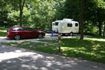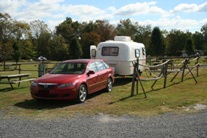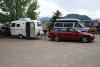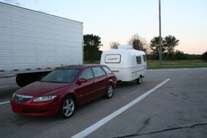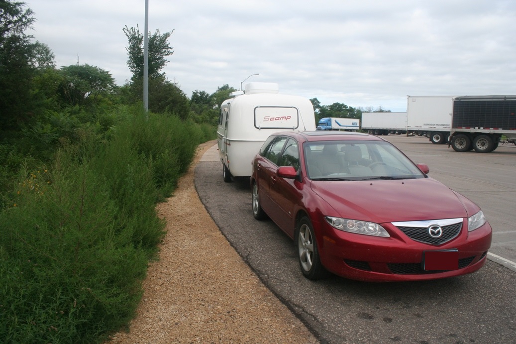 The first vehicle we used for pulling our Scamp was a 2004 Mazda 6 station wagon with a V6 3.0L Engine. One of the reasons we chose the Scamp was because the Mazda 6 was the largest vehicle that we had, and we were not sure how well it would handle pulling a camper. We used it to pull a slightly smaller trailer that we have for our SCA camping trips, but we only use that a few times a year. The Mazda 6 was quite capable, as we found out over the next few years, of pulling the Scamp through a wide variety of road conditions. We pulled it through the Rocky Mountains, through the Appalachian Mountains, through the desert, and across the Midwest through Missouri, Iowa, Wisconsin, and Minnesota. It is also nice knowing that we could pull it with the Mazda 6, unhook the Scamp, then return to the 25 MPG or better while touring the areas we were visiting. It is also nice to have a smaller vehicle to drive around in strange areas, rather than trying to drive a large tow vehicle around. There are a few things that I want to point out. While the Mazda 6 does a wonderful job, we do pay attention to "towing detail". We made sure to weigh the tongue of the trailer each time before hooking up. I did not want to exceed 300 pounds of tongue weight on the car. Actually, I tried to keep it around 10% to 15% of the total weight of the Scamp. That helped it to follow the car much better. Also, when going up and down steep inclines, I paid close attention to the RPMs of the engine so the transmission would not be slamming into gears just to make it up hills. Lastly, I would always recommend an electric brake system for the car and trailer. Going through the Rocky Mountains it was nice to be able to adjust the brake pressure when going down hill. It prevented the trailer from pushing and over stressing the car's brake system. Also, the electric brake controller in the car has a panic button that you can use to apply the trailer brakes without applying the vehicle brakes. This comes in handy if the trailer starts to sway a bit more that it should. The last couple of things I would like to point out concerns the trailer battery and the tongue weight of the camper. Since we used the seven prong connection for the trailer, we can charge the Scamp's battery from the car's engine while traveling down the road. But I would suggest that if you are going to stop for a longer period of time, you may want to consider disconnecting the trailer cable so you do not drain the car battery. Also, consider putting the front foot of the Scamp down and take the weight off of the hitch of the vehicle. I did not like going in the camper and adding my weight to the tongue weight on the car. Most of the time you are not going to hurt anything, but I figured why take the chance. Also, it makes walking in the trailer a bit more stable. I usually follow this routine when having dinner, shopping, or stopping at a rest stop for the night. If you do follow this advice, please make sure the trailer wiring connecter is reconnected and the foot raised before starting down the road again. Below are a series of photos featuring the Scamp and the Mazda 6 as the tow vehicle.